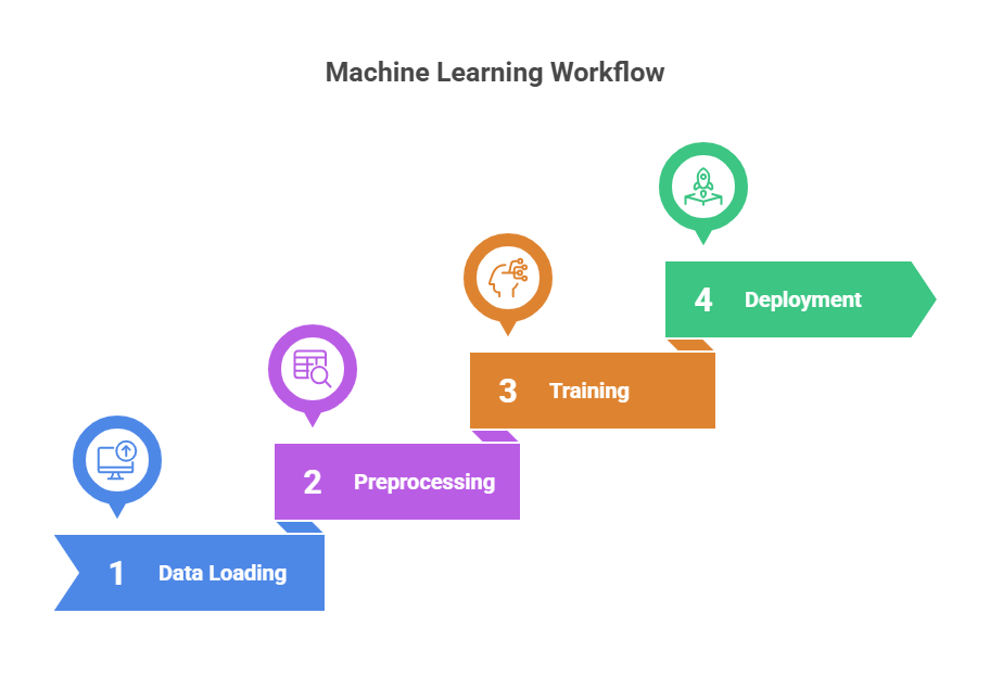 The terms like ML workflow/pipeline were unclear to me and had a repelling effect when trying to implement the idea. So we skip those terms for now and see what **steps** are involved and their **necessary order** of execution to get the results we desire, i.e. a trained model from a dataset, which is what those ML workflows or pipelines do.
